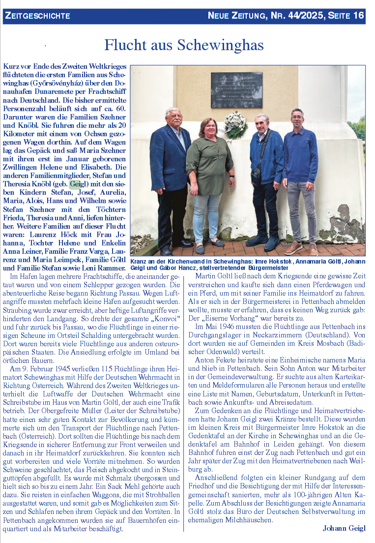 A Neue Zeitung, a magyarországi németek hetilapja október 31-i számában közölte az 1946-ban szüleivel együtt kitelepített Johann Geigl írását, amelyben felidézi, hogy 1945 elején, a második világháború idején hogyan menekültek győrsövényházi német családok nyugatra. A cikket Fülöpné Vass Emília fordításában közöljük.