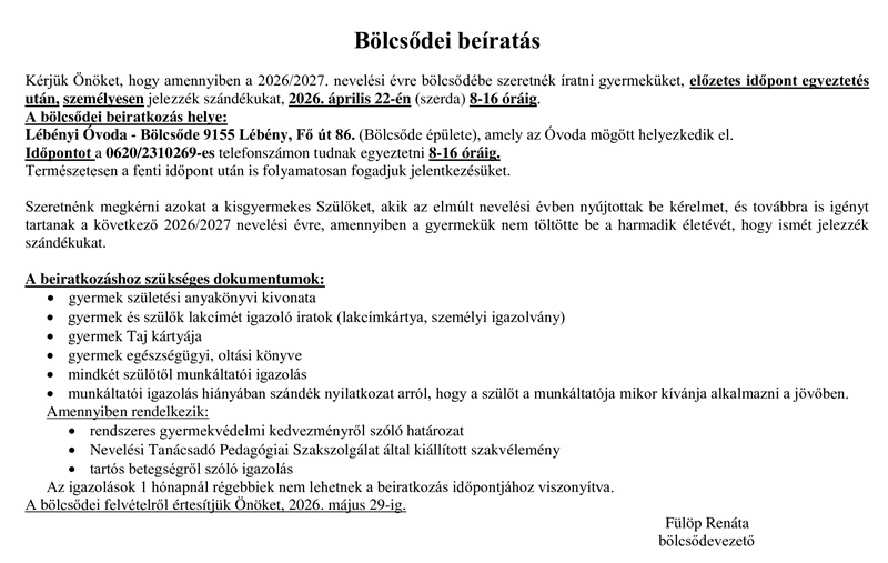 Beíratás 2026: győrsövényháziakat is vár a lébényi bölcsőde